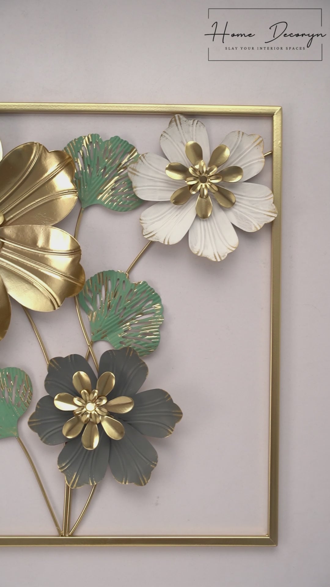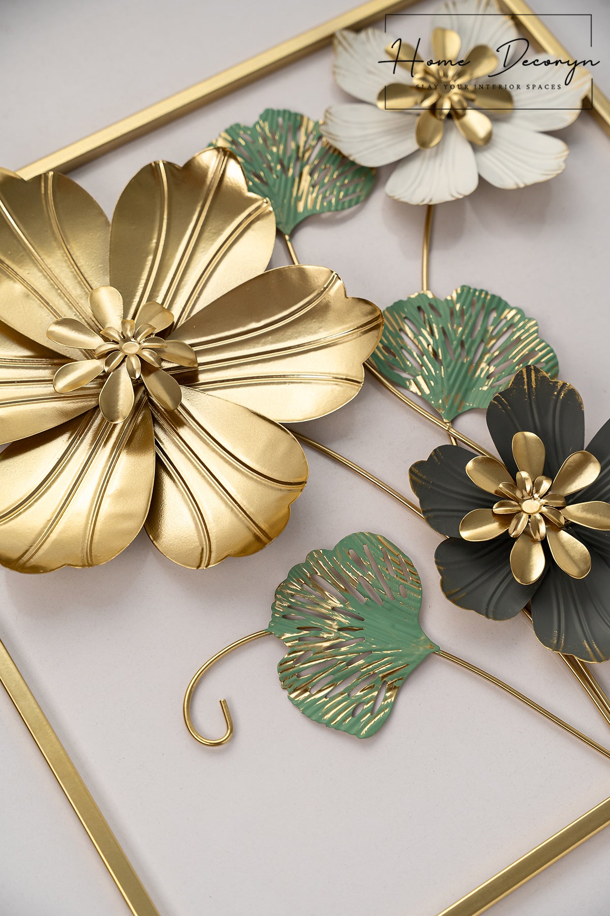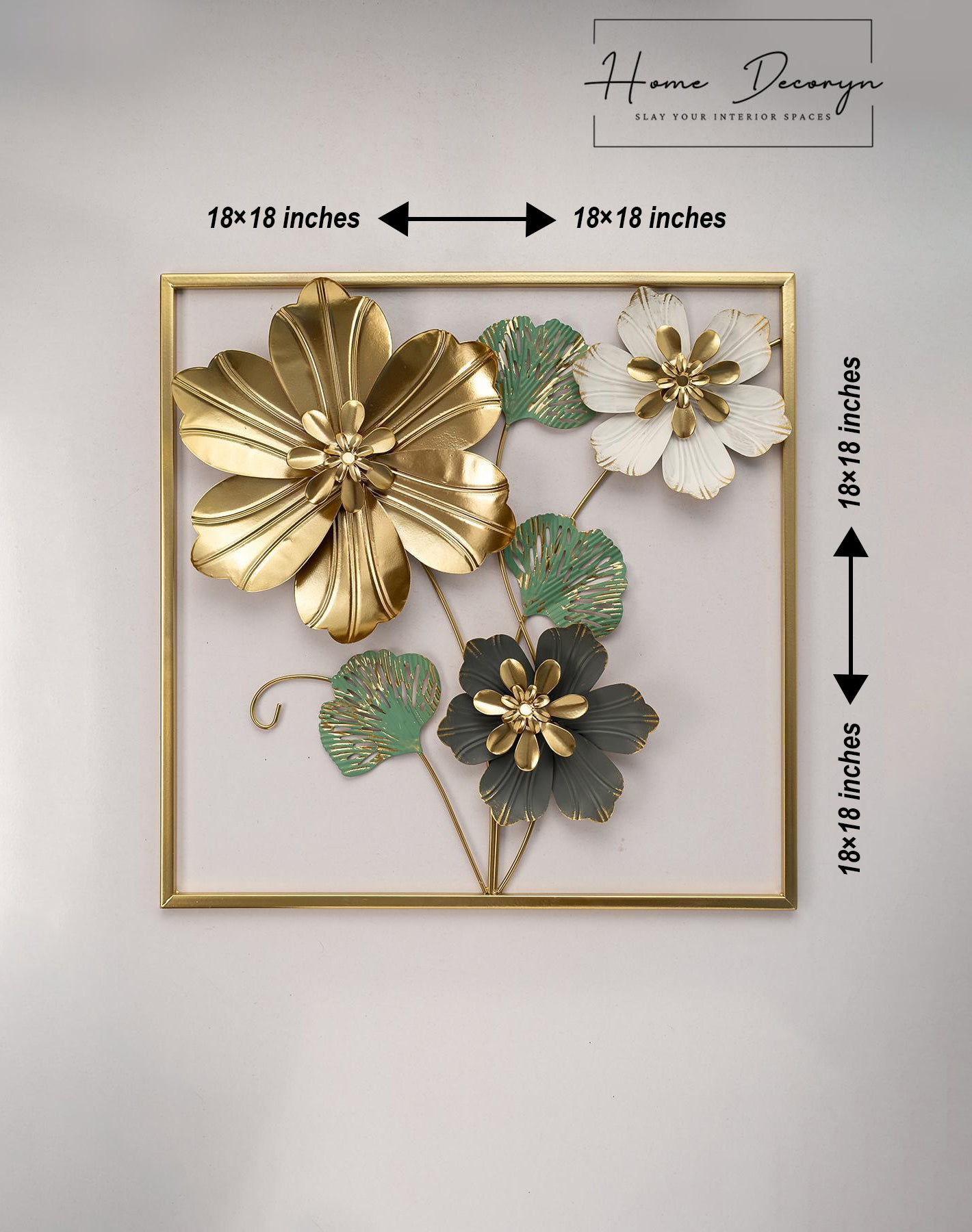 Presenting before you the CharGold Square - a stylish metal wall hanging frame that boasts a perfect square shape and a stunning color palette of green, charcoal, and white. Impressively, the frame is coated in a luxurious golden hue, adding a touch of elegance to any space.