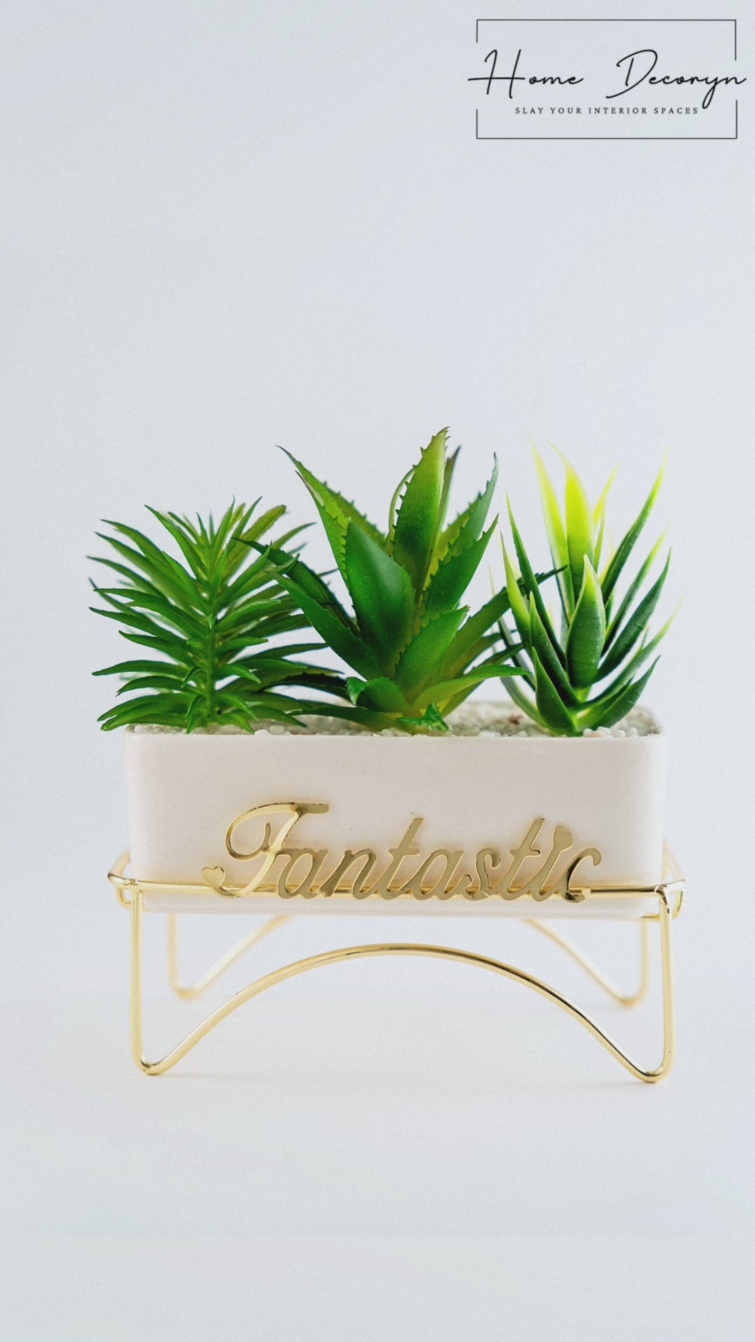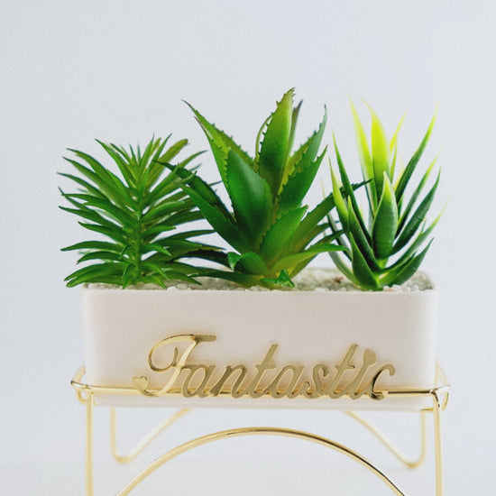 Stylish white ceramic pot nestled in a sleek golden metal frame, adorned with the word “Fantastic.” A chic plant holder that adds a modern, uplifting touch to your décor.
